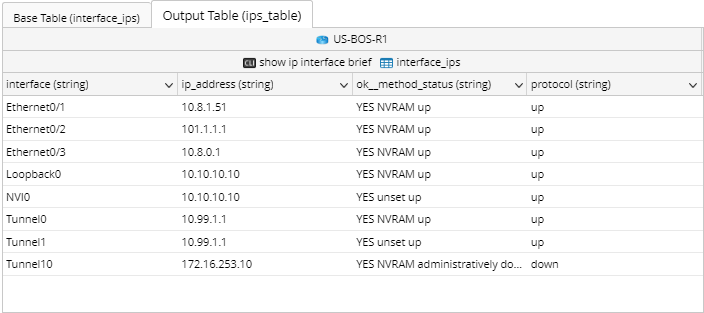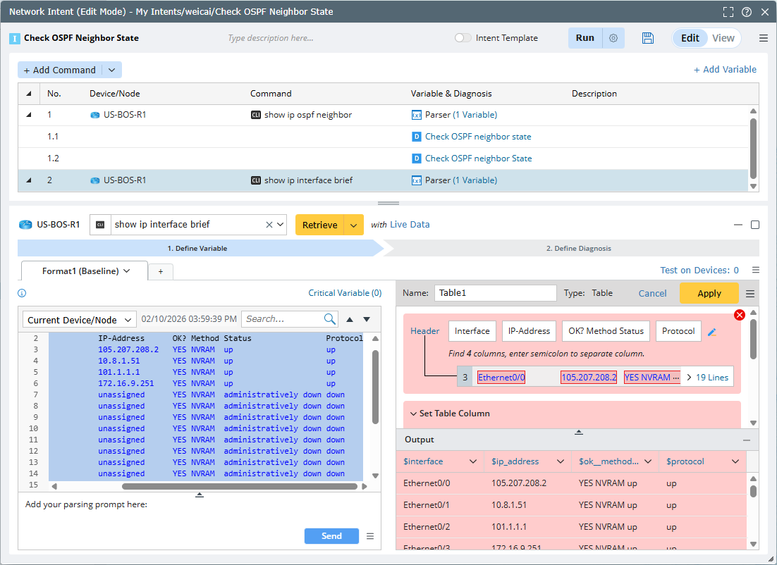 - Build an intent to parse the IP addresses configured on all interfaces on the device via the command show ip interface brief.