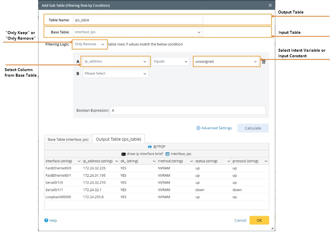 Complete the following steps to use sub table to filter table row by specified condition, for example, create a sub table to only keep the interface with the IP address configured.