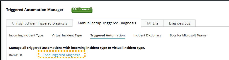 Click Manual-setup Triggered Diagnosis > Triggered Automation tab and then choose +Add Triggered Diagnosis.