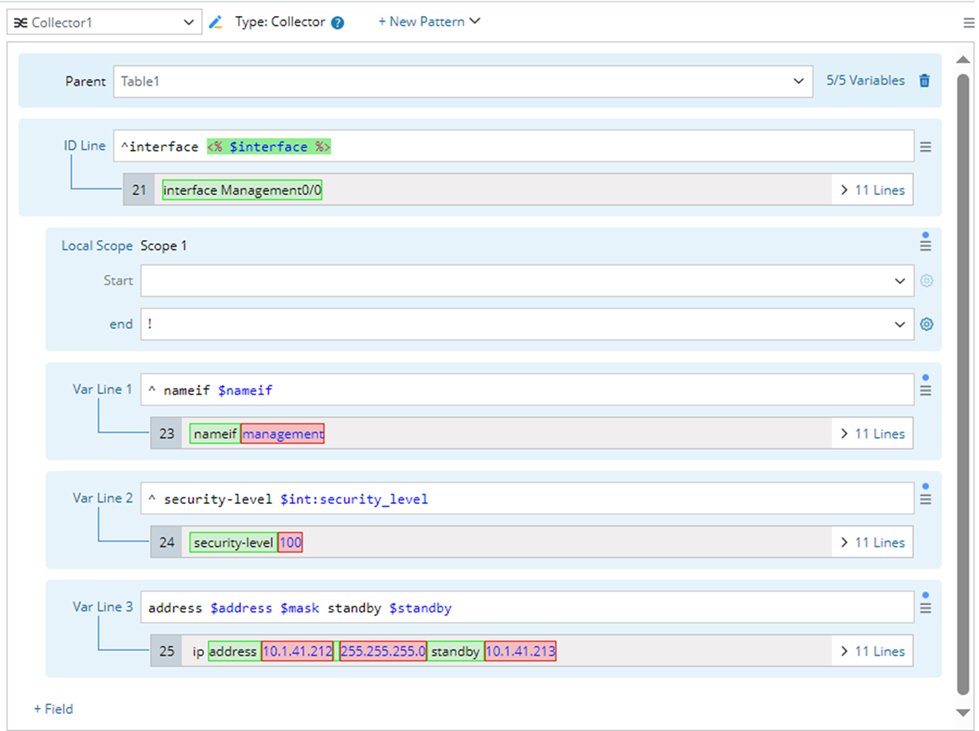 - Define a table pattern to parse device network configuration, and get variables $interface, $name, $ip_address, $subnet_mask, and $method.