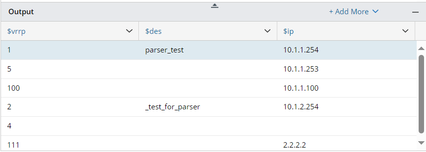 - Variable Template <% $var %> in Collector Parser: When the variable template is used, the variable in the var line is not defined in the form of $var. Instead, the variable in a var line is replaced with the corresponding string type variable based on the ID variable value of the current group. The Var line pattern with the variable template will match the input text. For example, if we define the line pattern "vrrp <%$vrrp_num%> address-family $address_family" for parsing the address family data for all vrrp, the variable template <%$vrrp_num%> means the system will parse matched values in this Var line in every group decided by the vrrp_num value. For more information about variable template, see Declare Variables/Variable Template <% $var %>.