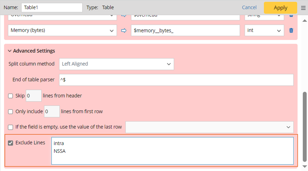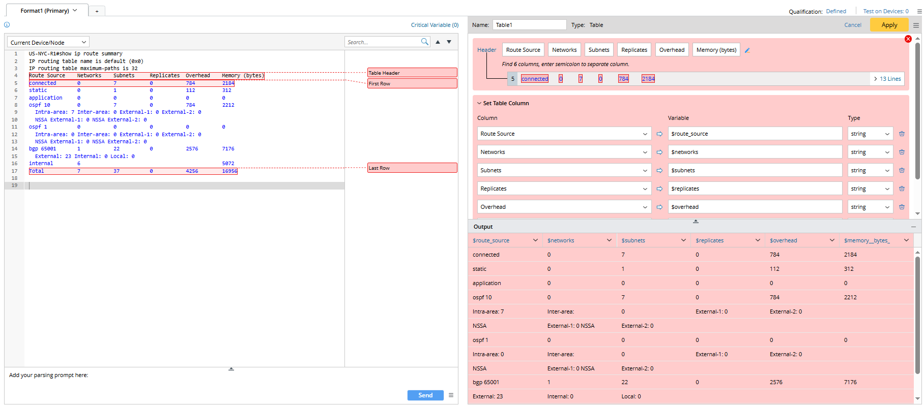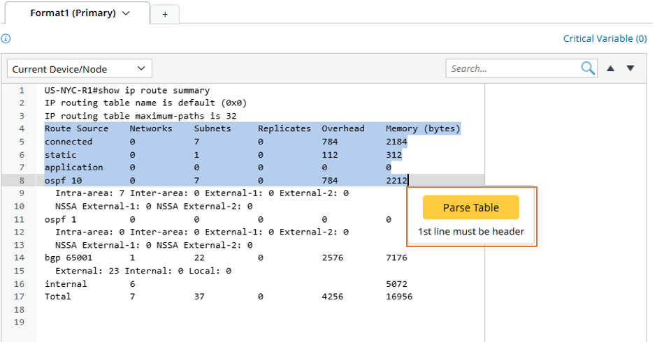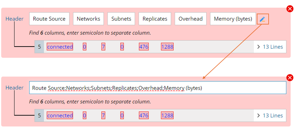 The Table Parser parses table-formatted text, such as NDP tables, VRF tables, OSPF neighbors, and more. With the Table Parser, you can address the line of table headers in the raw text and then use the column separator to manually adjust the table columns.