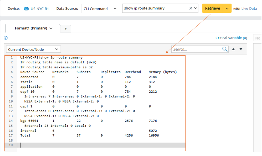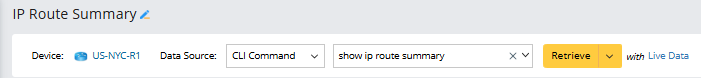 In this example, you retrieve CLI command data for the command show ip route summary from the device US-NYC-R1.