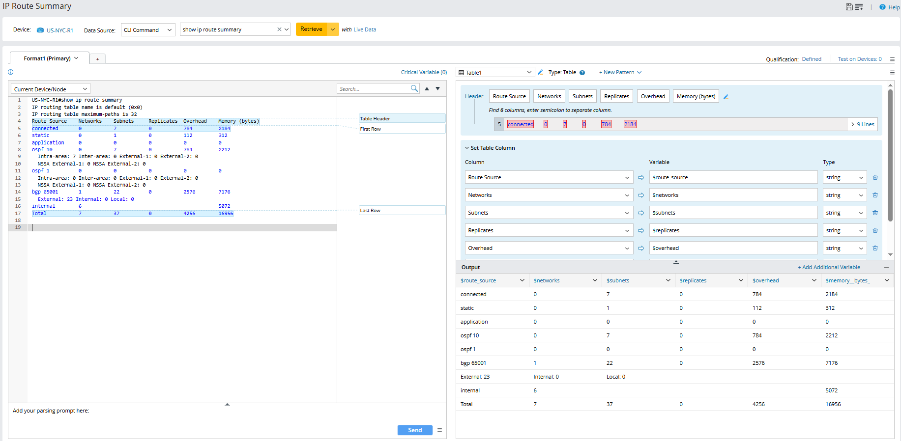 Take the parsing of the IP Route Summary table as an example. You can define a Table Parser to parse the IP Route basic information.