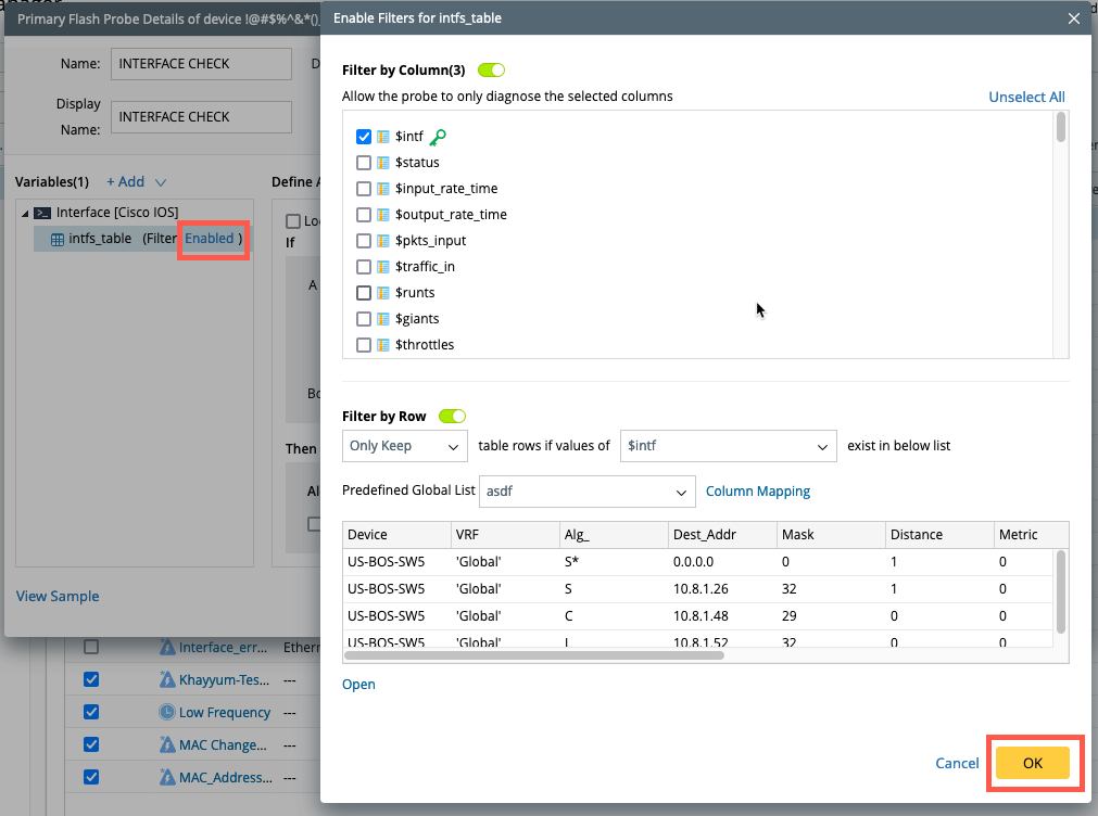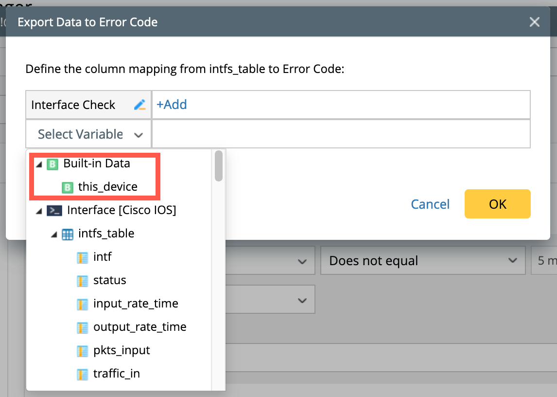 - When the level is set at the Interface Level: Select Add Device Variable or Add Interface Variable from the drop-down. Search the variable by the keyword (of the variable or command) and select the variables. Click OK.