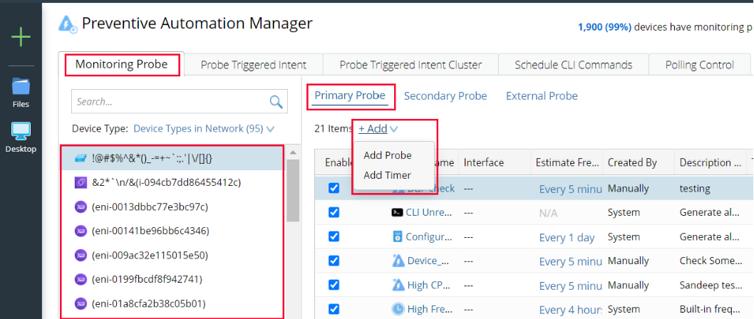 Click the Monitoring Probe tab and Primary Probe tab, select the target device on the left and click +Add. From the drop-down list, select Add Probe.