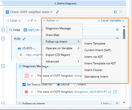 During intent definition, users are provided with the following critical actions and operations to make their intents applicable to more diagnostic scenarios.