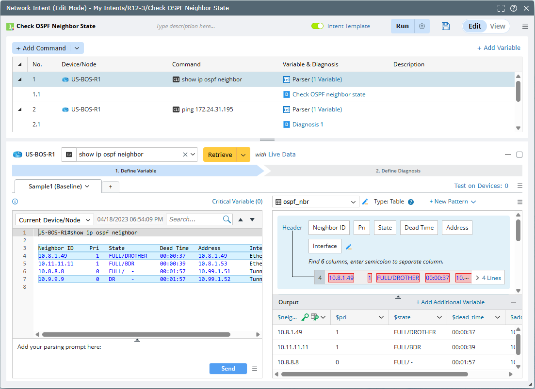 NI takes the device configurations and CLI/API/SNMP commands as the input and leverages Visual Parser, a UI-based no-code parser, to define the variables and the diagnosis logic for these variables.