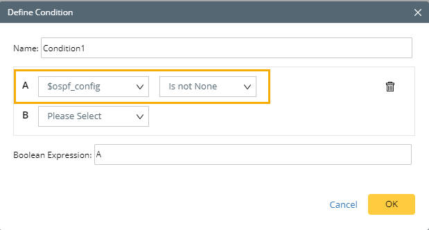 icon, select Basic Output and click Extend. - At the Output node, define conditions for the Qapp to execute the subsequent actions. In this case, define a condition to check that a device is configured with OSPF.