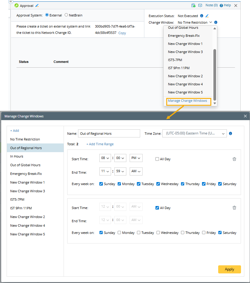 Note: The change window is for reference only and does not prevent users from executing the template outside the change window. |