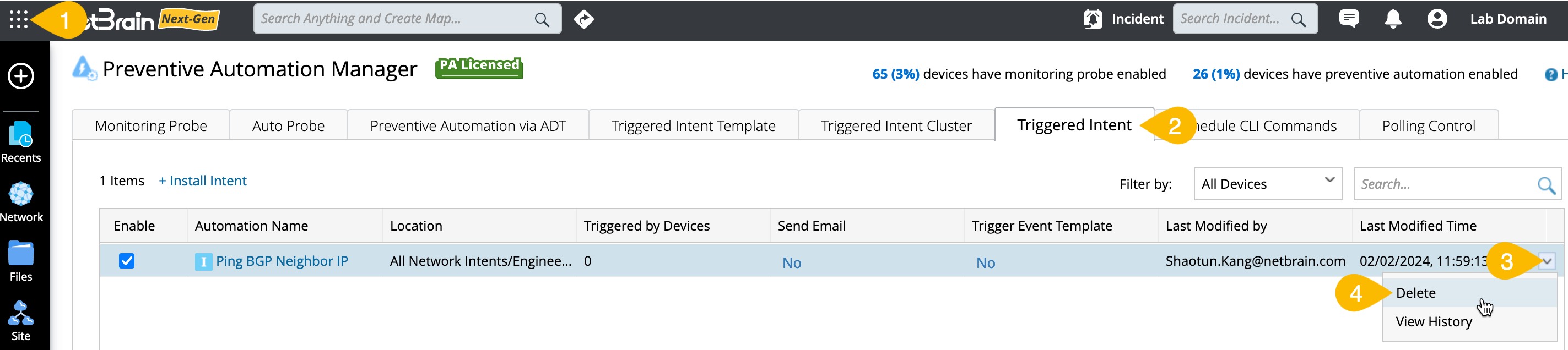 To delete an intent in the Preventive Automation Manager: