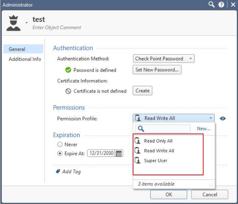 - Assign permissions to the account that you use for your NetBrain system to access the Checkpoint data. You can select any of the following three permission profiles in General > Permissions > Permission Profile.