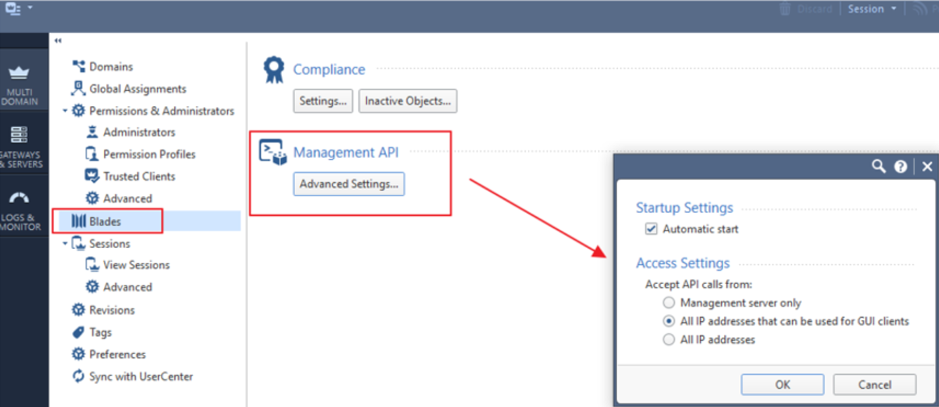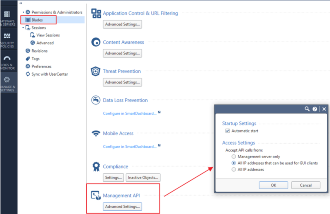 - Enable API access to accept API calls from your NetBrain Front Server. Go to Blades > Management API > Advanced Settings > Access Settings, and select the All IP addresses or All IP addresses that can be used for GUI clients option.