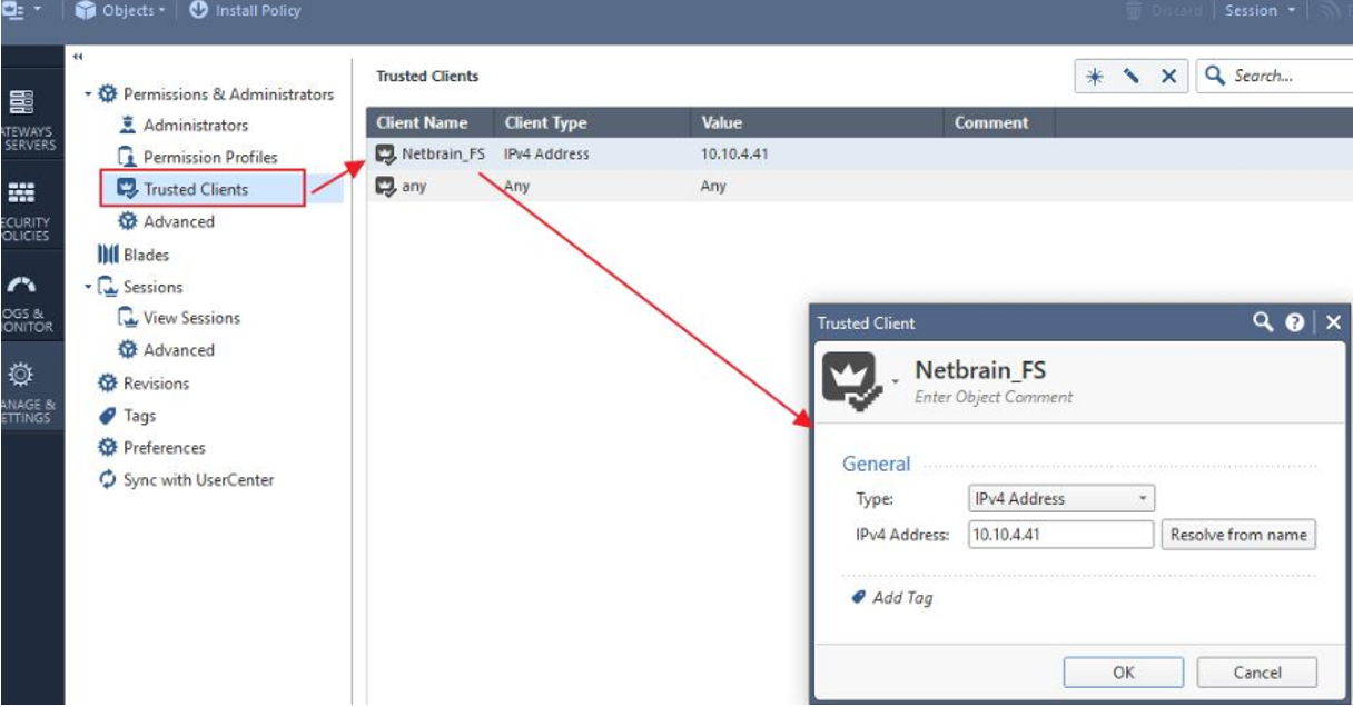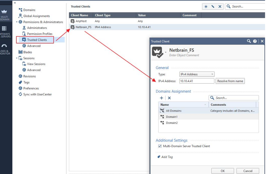 Note: If you select the All IP address that can be used for GUI clients option, add the IP address of NetBrain front server to the Trusted Clients as follows: |