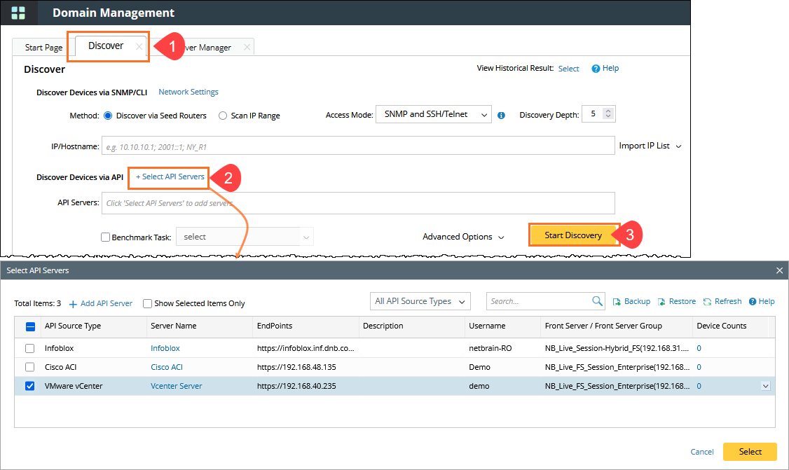 Note: To perform a multi-site discovery, you must select MSO as API Server. Then all sites belonging to the MSO can be auto-discovered by NetBrain. - Click Start Discovery.