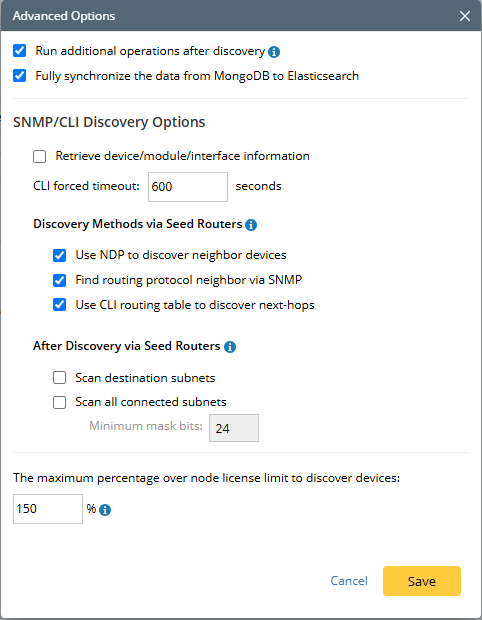 - The maximum percentage over node license limit to discover devices — This ratio represents the max percentage of devices that the domain will discover once the node license limit is exceeded. 0 means the system will stop discovering when the discovered device number equals the license limit.