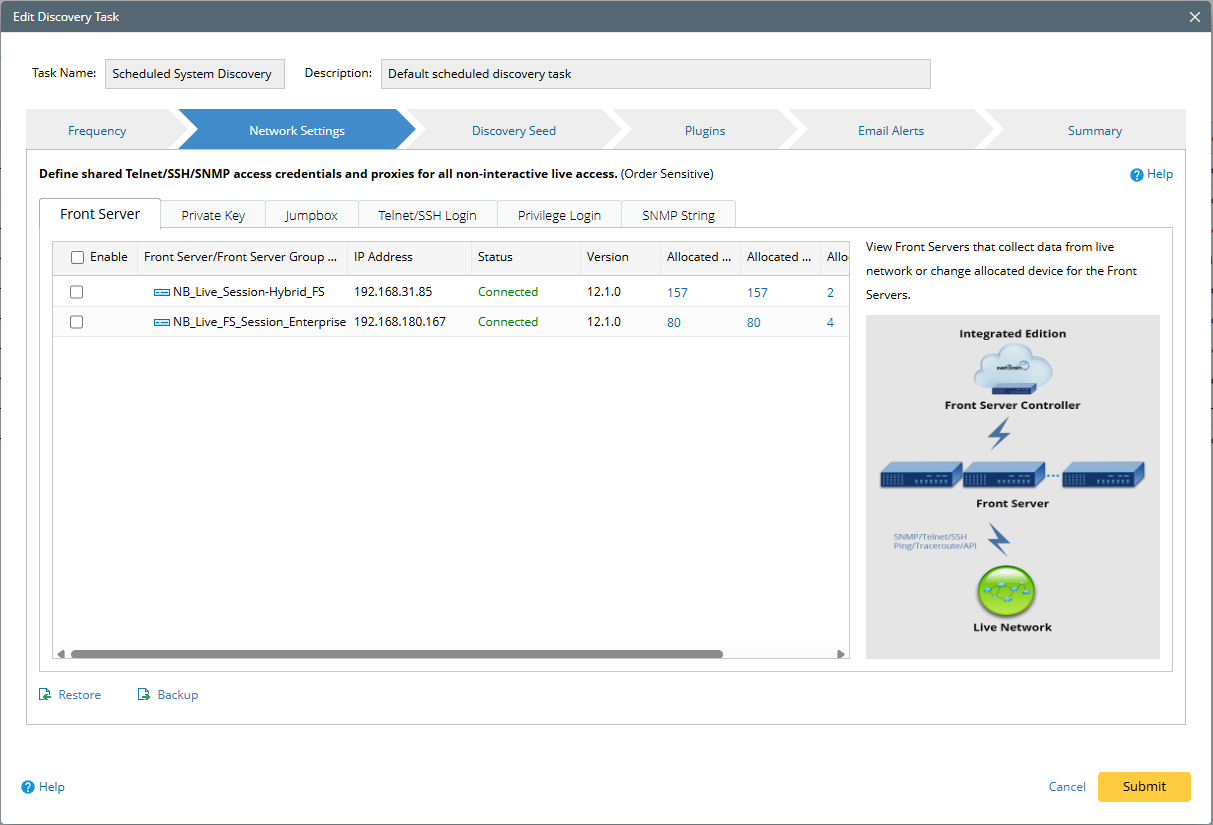On the Network Settings tab, adjust the network settings for the scheduled discovery, including Front Server, private key, jumpbox, Telnet/SSH login credentials, privilege login and SNMP string.