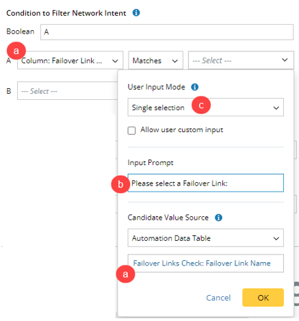 - The value candidates are from the selected column in the same ADT. In this example: From the Failover Link Name column in the Failover Links Check ADT.