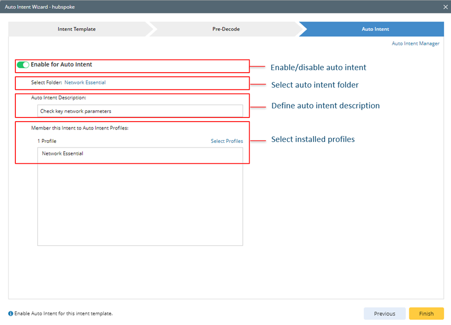 After configuring all the settings, click Finish in the lower-right corner to enable the intent template for auto intent and close the wizard.