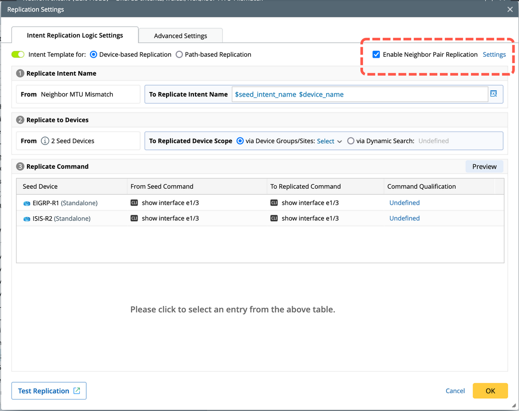 - By default, the window will open in the Intent Replication Logic Settings tab. Check the selection box of Enable Neighbor Pair Replication.
