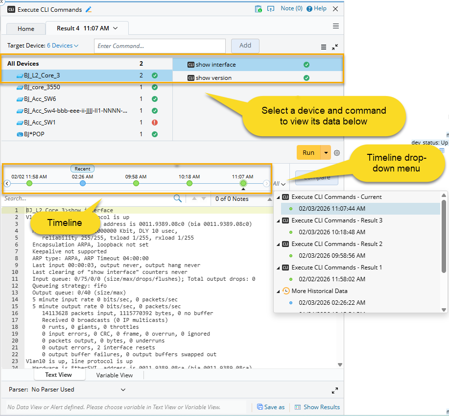 After execution, select a device and a CLI command to view its output. To view or compare historical data: