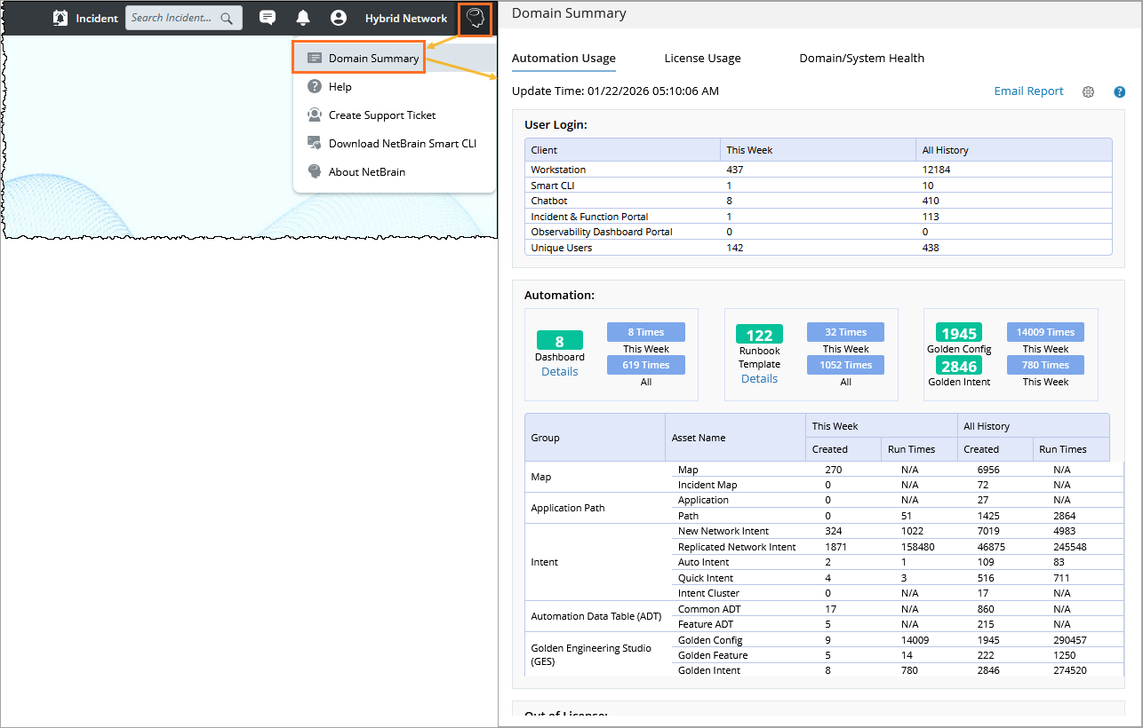 - Automation Usage: The Automation Usage tab help you understand usage trends for dashboards, runbook templates, and golden rules
