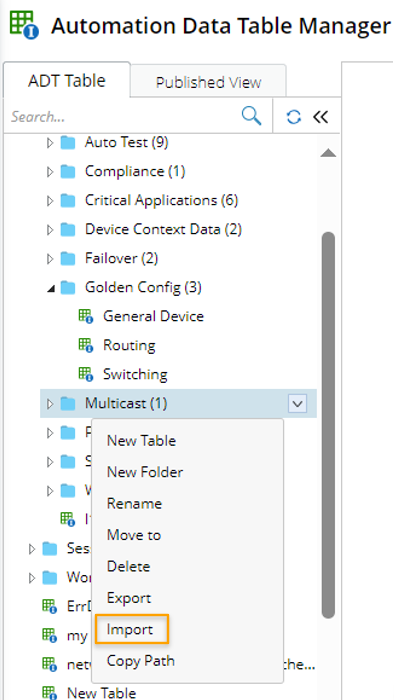 The system enables users to import an ADT file to be used in the NetBrain system. You can select a folder (both major folders and subfolders can be selected) for storing the imported ADT file from the Folder Tree in Automation Date Table Manager, then import the ADT file and save the imported ADT file under the folder.