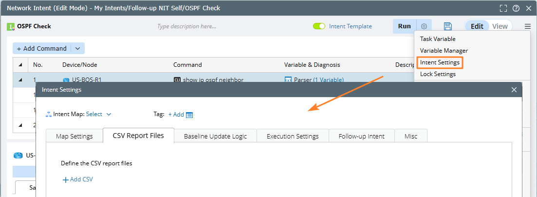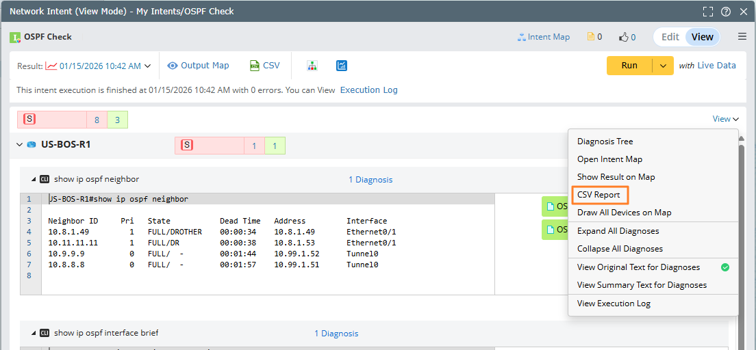 - Run this intent and in NI View Mode, click View > CSV Report to view the generated CVS report.