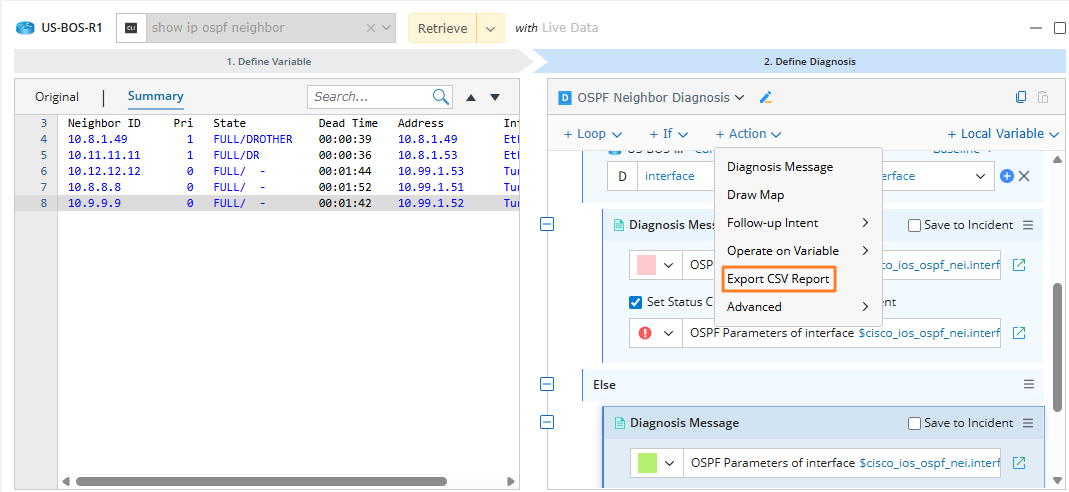 - On the Define Diagnosis tab, click Export CSV Report from the drop-down list of Action.
