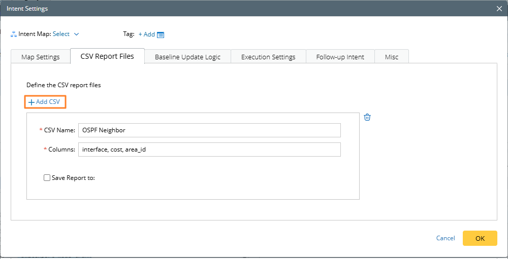- Select the Save Report to check box to specify the NetBrain files folder for CSV report from intent.