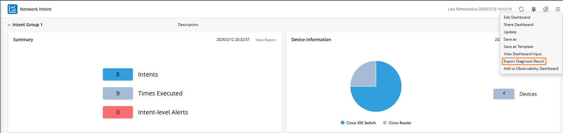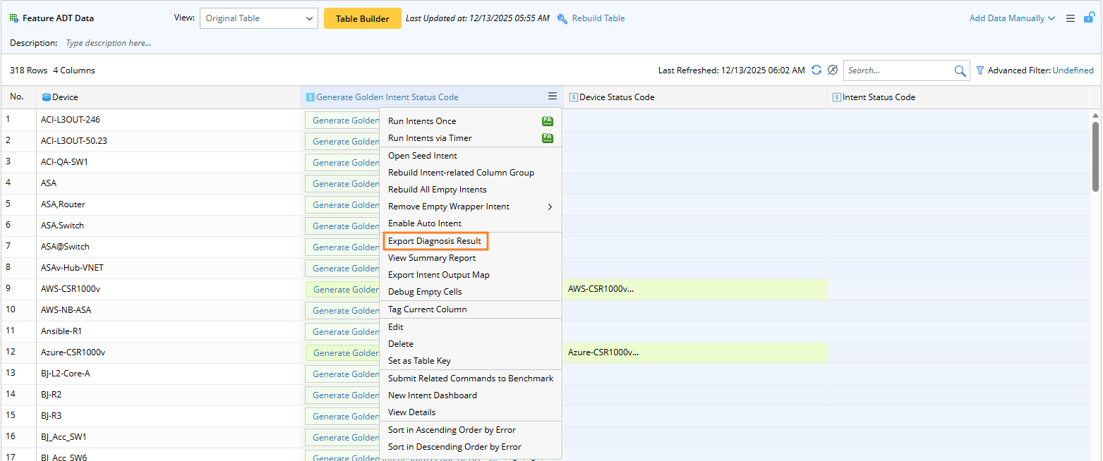 For the network assessment scenario, you may create a large number of intents to check the device data (such as configuration files) of different devices and output the diagnosis result into the diagnosis messages. And now, the main places to view these intents’ results are the dashboard and ADT. You can export the diagnosis message as a CSV report to check the diagnosis messages of all related intents based on the dashboard or ADT column to quickly analyze whether there is a problem with the network.