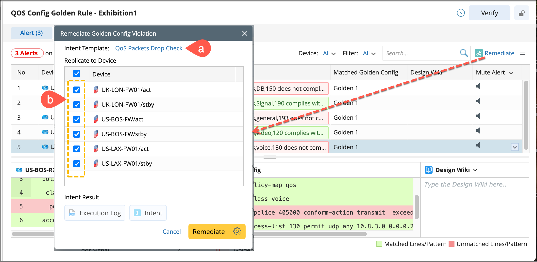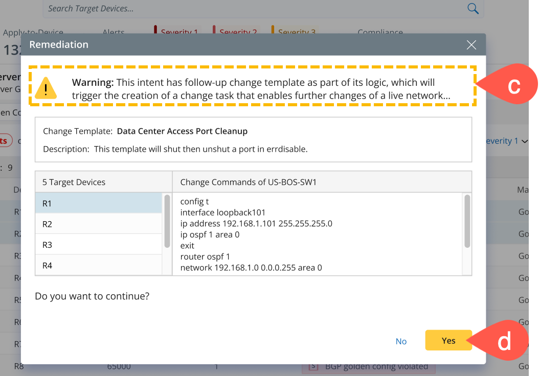 Remediate: This function executes an intent to identify the golden config and configuration type on a device. After evaluating the differences, create a configlet to resolve detected issues. To remediate the devices, follow these steps: