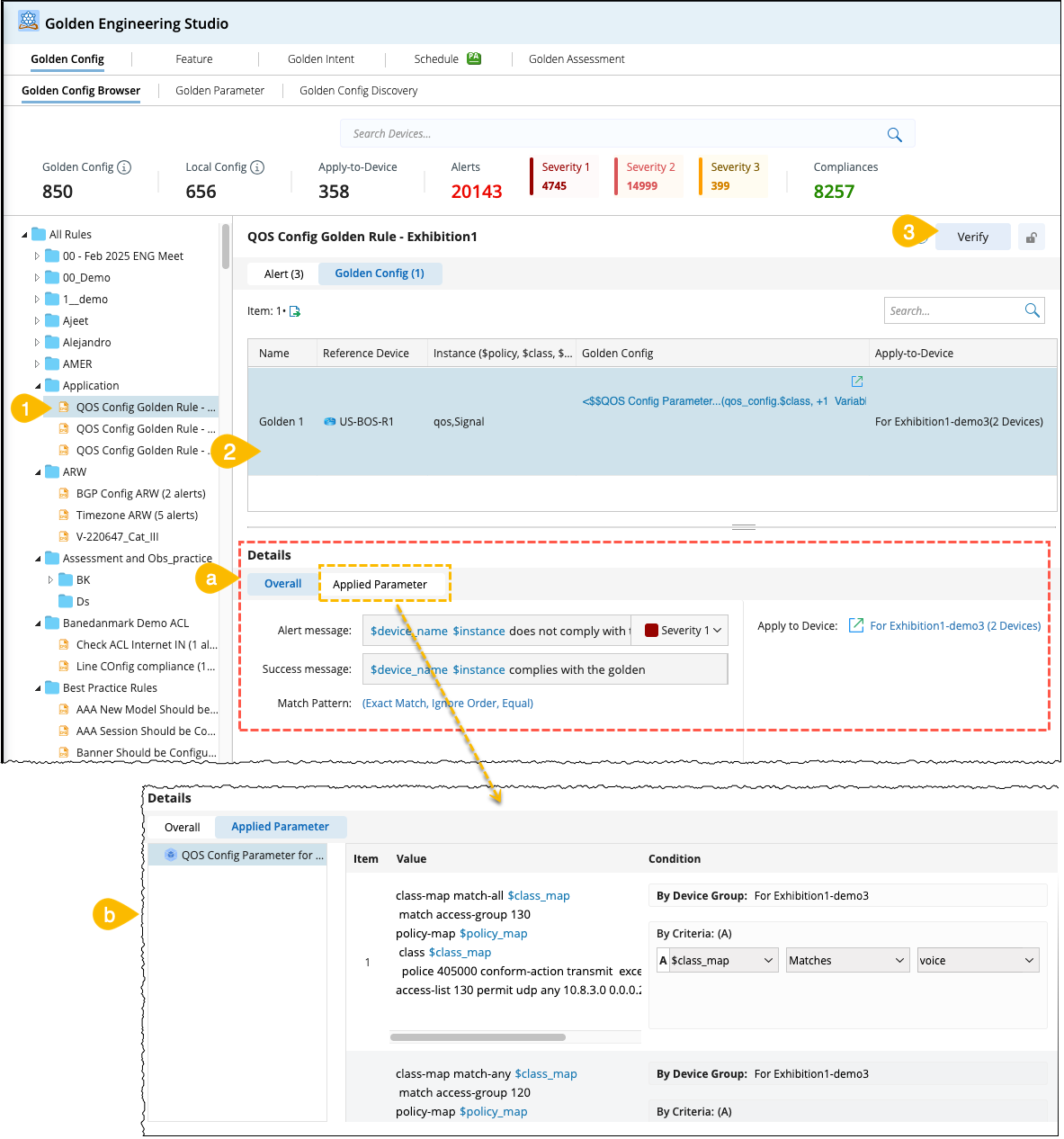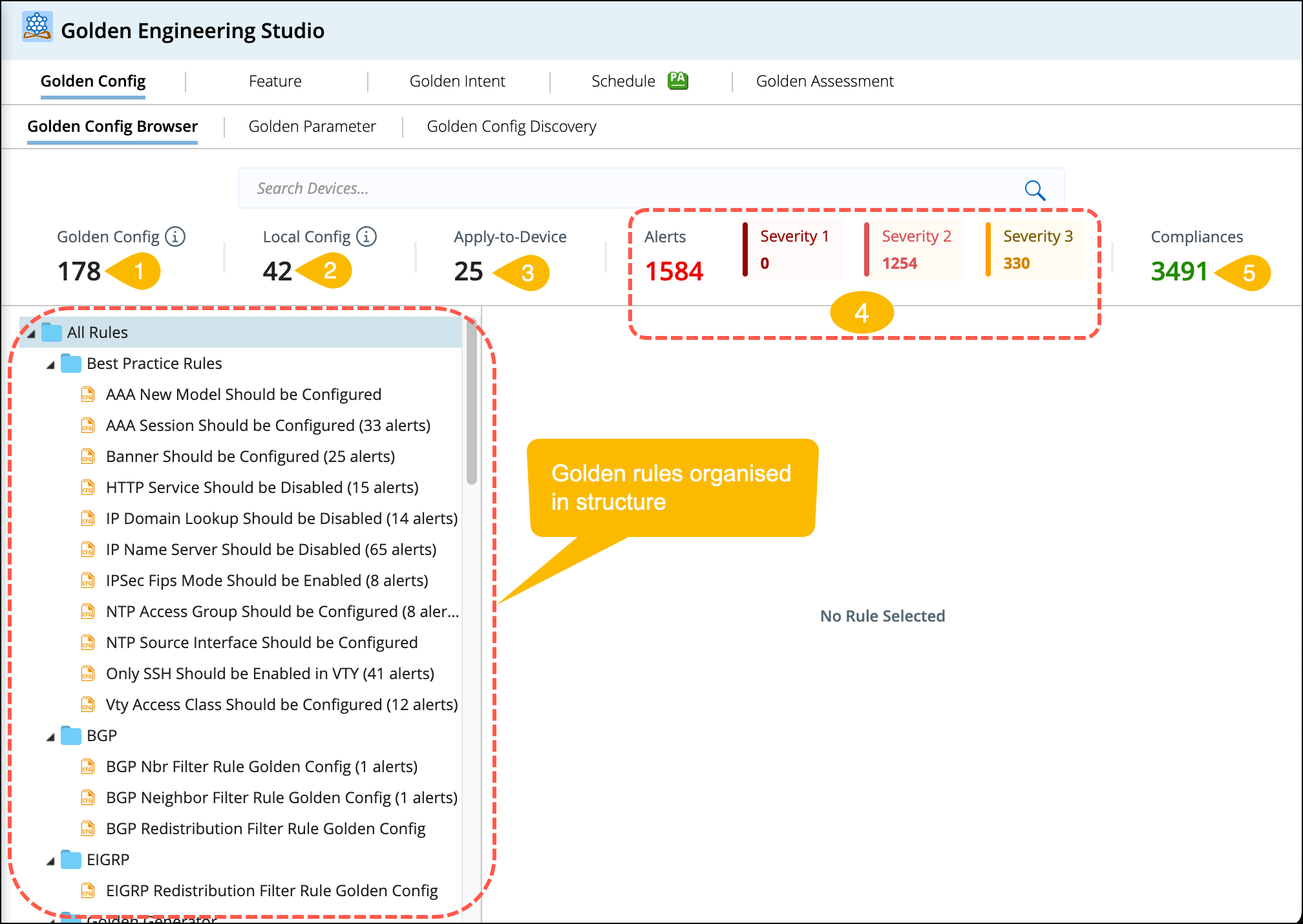 Golden Config (GC) Browser provides a summary of the golden rules in an organised folder tree structure and a dashboard with the total number of golden configs, Local Configs, Apply-to-Devices, Alerts (with severe alert numbers at each level), and the number of compliances.