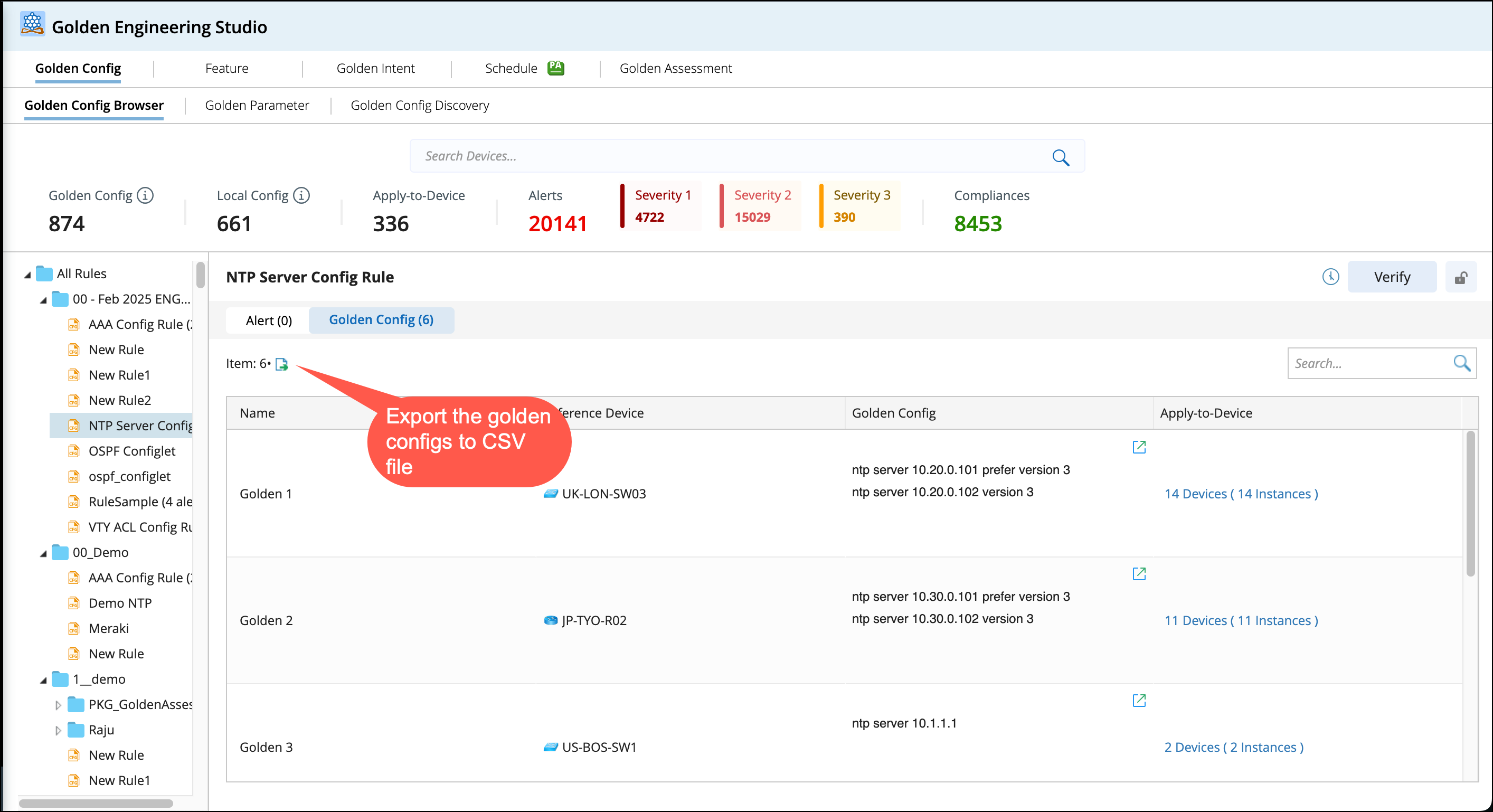 You can select a Golden Rule and export all associated Golden configurations to a CSV file using the option