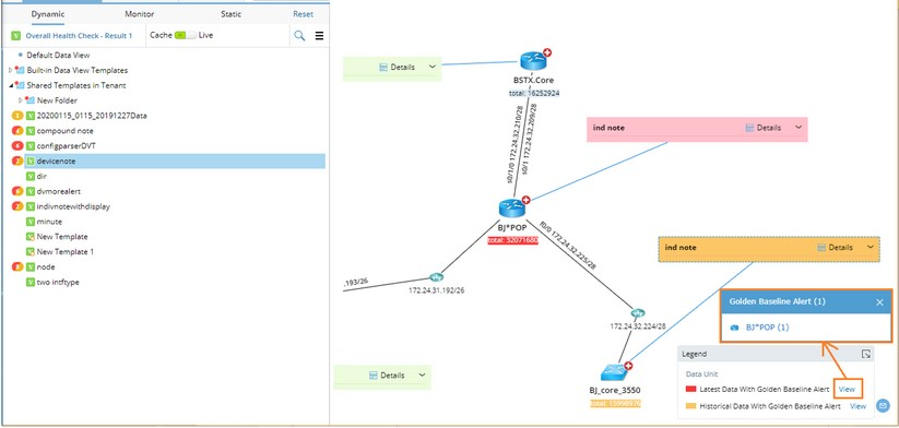 (A Combination of Latest and Historical GB Alerts) | ▪This data view has Golden Baseline Alerts for X device/interface variables detected in the latest run. ▪This data view has Golden Baseline Alerts for Y device/interface variables detected in the last six months. ▪X + Y = 6 |