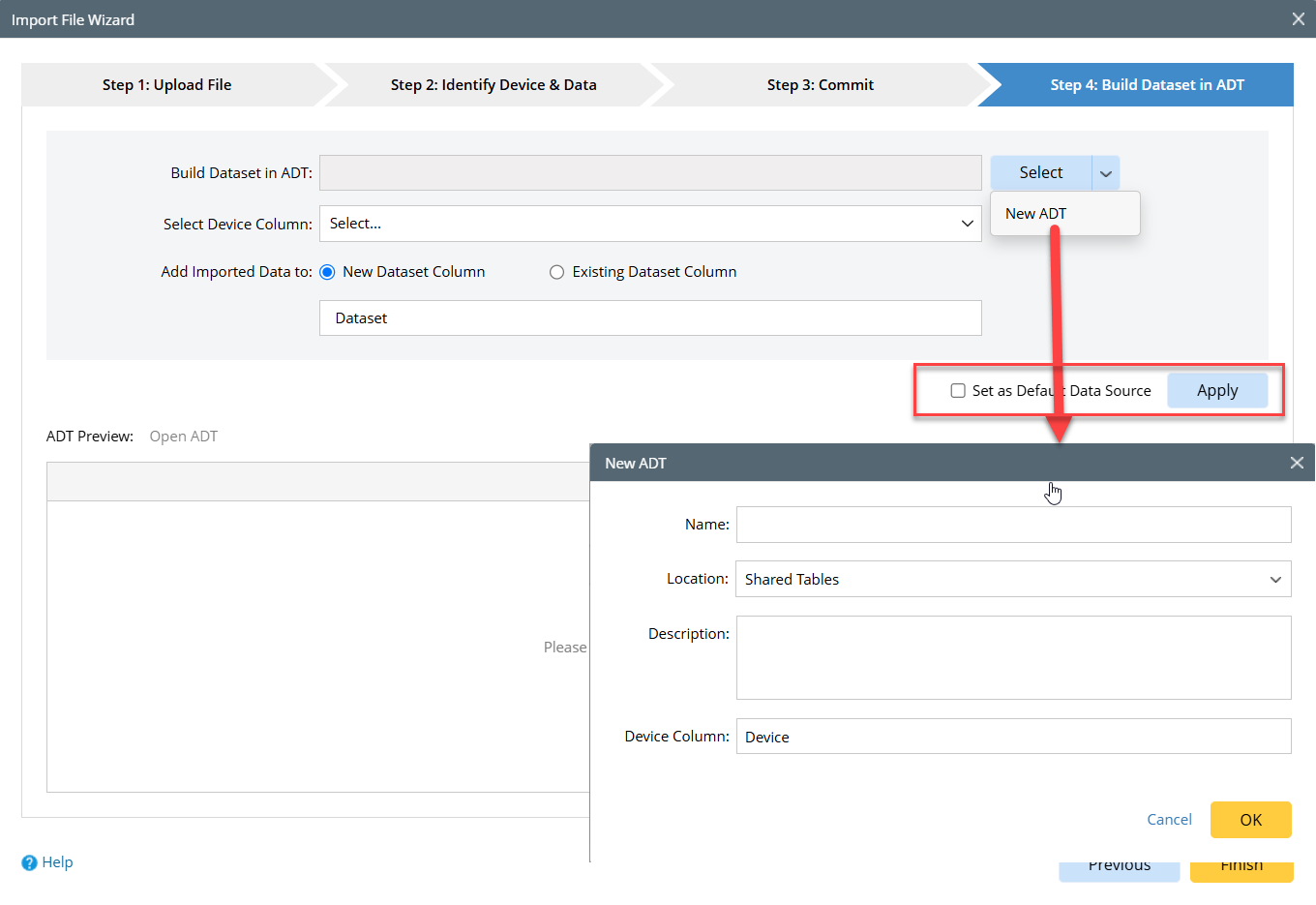 In this last step, you can build an ADT dataset, which can be used as the default data source for all automations. Create a new ADT under a shared folder and select the New Dataset Column. Then check the checkbox Set as Default Dataset and click the Apply button. After that, the imported configurations and CLI data will be used by automation, such as Golden Discovery and Golden Intents.