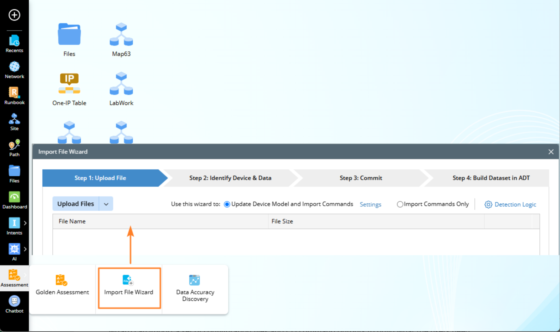 For network consultants who have no/limited live access to the network, Import File Wizard can enable them to use the system's intent-based automation functions to do network assessment for their customer. For example, they can import a set of device command data files to build dataset and then do network assessment based on the dataset.