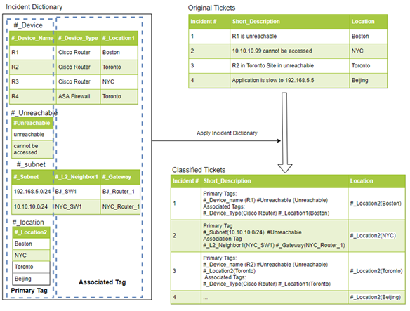 R12.3-20260213 Incident Dictionary The Incident Dictionary is used to classify incoming Incidents with Hash Tags. As illustrated by the diagram below, Incident Dictionary translates the original tickets into structured data, which filters suitable NI/NIT/member NIs/ADT intents. Define Virtual Incident Type Incident Dictionary Main UI