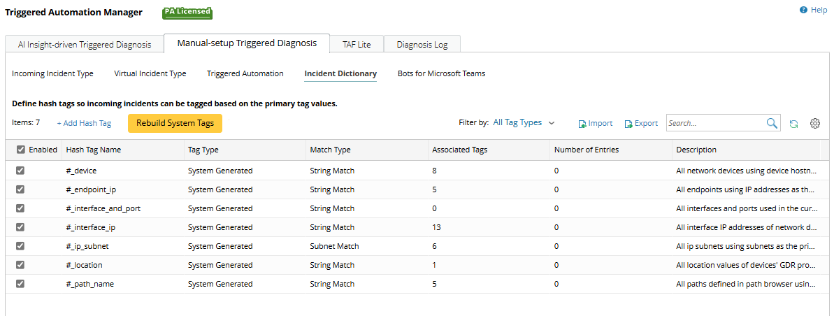 Incident Dictionary lists all system-generated and manually created Hash Tags by name, tag type, match type, associated tags, number of entries, and description. The Hash Tag can be searched by names and descriptions. Also, they can be filtered by the tag type, and all columns can be sorted in numerical and alphabetical order.