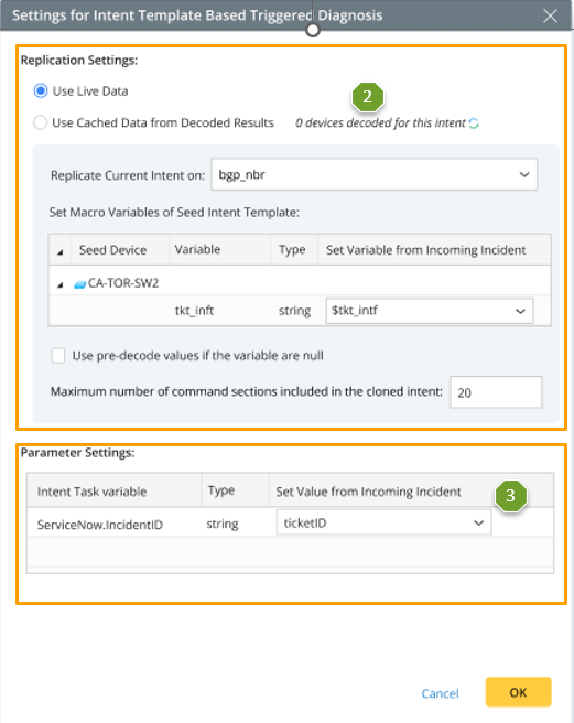 - After the intent template is selected, the Settings for Intent Template-based Triggered Diagnosis dialog will pop out, or you can click Settings for Intent Template, then define the settings in this dialog.