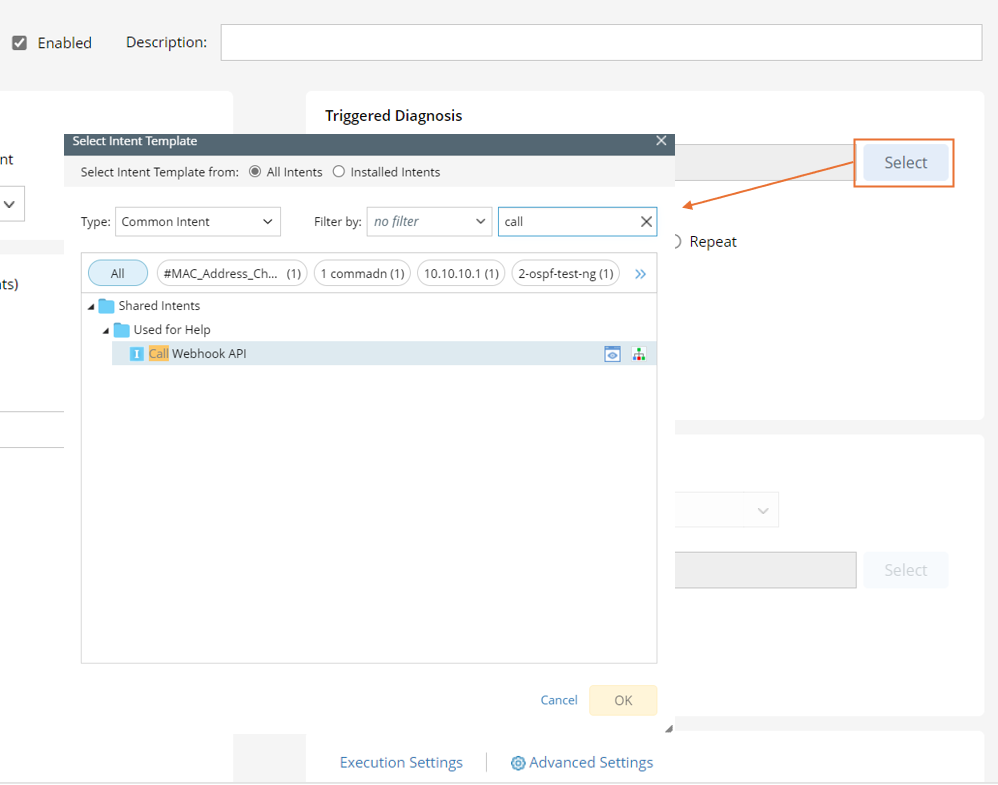- Click Select. In the Select Intent Template dialog, enter search keyword to find the proper intent, then select the intent template "Call Webhook API".