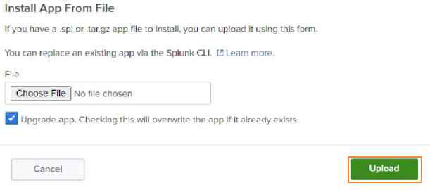 - Choose the application file you have downloaded above and click Upload. Make sure to click on upgrade app to check if the NetBrain Splunk app is already installed in the customer’s Splunk app.