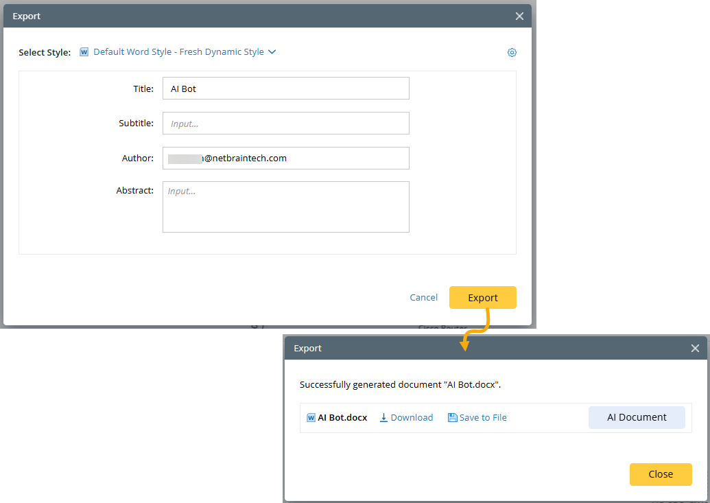 Export Document. Export the response to a Word file. You can download it to your local drive, save it as a NetBrain file, or go to AI Document to edit it before saving.