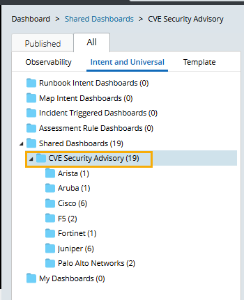 The intent dashboards are placed in the CVE Security Advisory folder. You can locate them by clicking the start menu, and navigating to Intent-Based Automation > Intent Dashboard > the All tab> the Intent and Universal tab > Shared Dashboards folder > CEV Security Advisory folder.