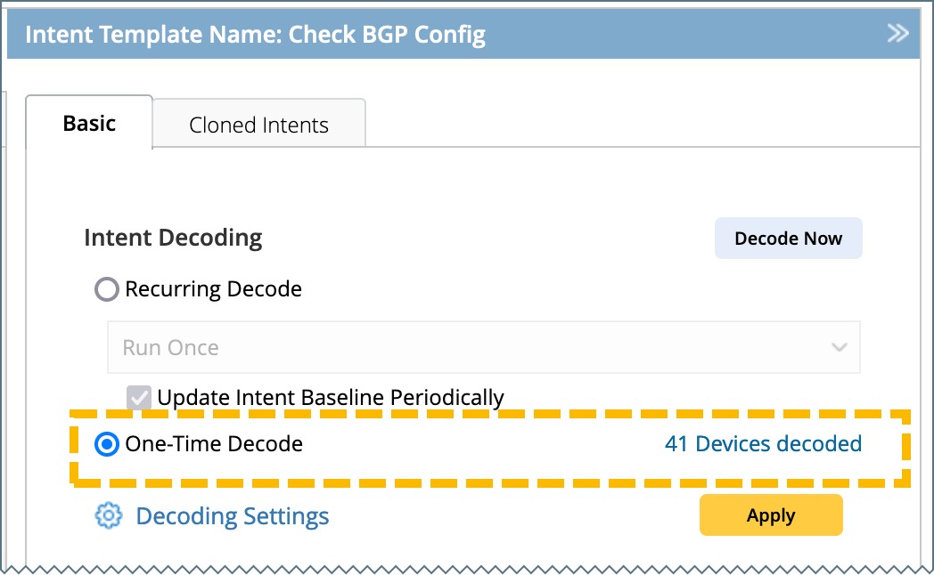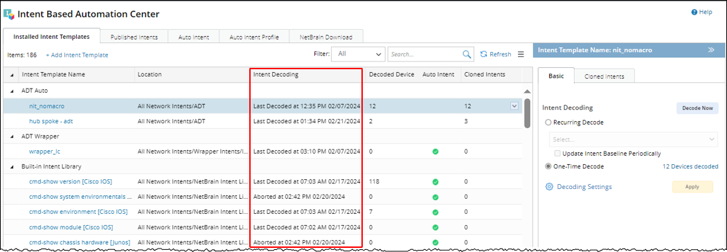When an NIT is added to the Intent-Based Automation Center, One-Time Decode is enabled by default, and the system performs an initial decoding. Alternatively, you can manually trigger decoding using the Decode Now function. The result will be displayed next to the One-Time Decode field. For details on decoded devices, refer to View Decode Results.