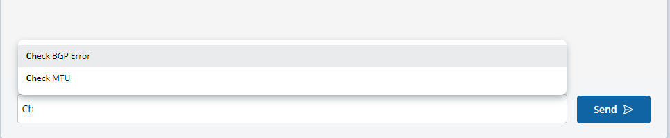 - More examples for auto-completion: Check MTU and Check BGP Error buttons are available. Enter Ch and press the Tab key, the first option will be auto-completed. In this example, Check BGP Error will be completed.