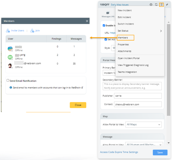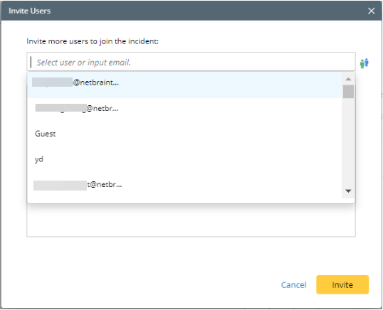 To invite team members to access an incident, you can either share the Incident URL or directly invite the users with NetBrain accounts to the Incident. Invited users will become members of the Incident as soon as they accept the invitation and join the Incident, enabling them to share the same information.