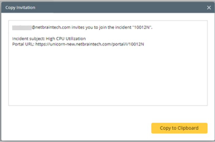 You need to obtain the incident URL and access code to invite users without NetBrain accounts to be members of an incident.