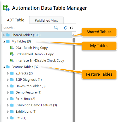 Automation Data Table Manager is a centralized management interface of ADTs where you can create, edit, and delete ADT, among other operations. It consists of the following components: