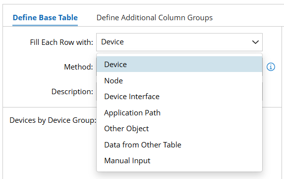 Description Device Device Group Each member device of the selected device groups will occupy a row. Site Each member device of the selected sites will occupy a row. Map Each device inside the selected maps will occupy a row. Pre-Decoded Intent Template Each qualified device after auto-intent decoding process for an intent template (NIT) will occupy a row. Node Group Each node in the selected group will occupy a row Dynamic Search Each node found via dynamic search occupy a row Pre-Decoded Intent Template Each node after auto-intent decoding process for an intent template (NIT) will occupy a row. Device Interface Device Group Each member device interface of the selected device groups will occupy a row. Map Each visible interface on selected maps will occupy a row. Application Path N/A Each A to B path object selected from Path Browser will occupy a row. Other Object Map & Map Intent Each map and associated map intent from the selected folder and all sub-folders will occupy a row. Device Group Each selected device group will occupy a row. Site Each selected site will occupy a row. Intent from Intent Cluster Each member intent inside the Network Intent Cluster (NIC) will occupy a row. Data from Other Table Merged ADT Build the current table by merging 2 or more existing ADTs. Subset of ADT The current table is a subset of an existing ADT defined via formula. Imported CSV Build a table by importing a CSV (comma-separated value) file. Manual Input N/A Manually define base row and column.